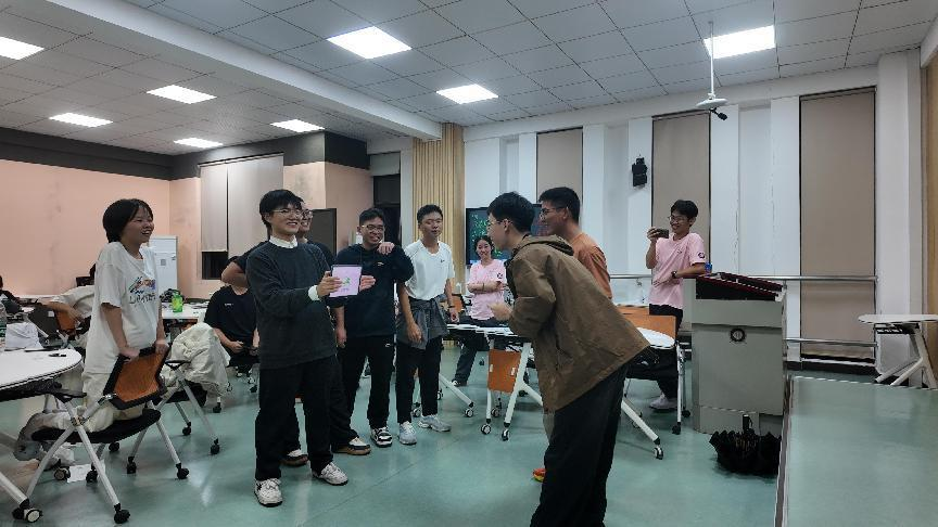 紧接着进入快乐团辅活动环节。“三二一,开始!”随着计时器跳动,现场“社恐”都秒变“社牛”,演绎经典桥段更是信手拈来。随后“显眼包”大赛正式打响,十分钟的头脑风暴,四个小组依次登台,队名一个比一个卷。进入烧脑局后,同学们都集中注意力描述和观察,既不能让卧底得逞也不能让自己失败。“原以为大家会拘谨,结果全程尖叫分贝超标!”临时负责人看着群里瞬间刷出的99+消息感叹,“我们已经约好周五一起夜跑;智慧教室的灯,照亮的不只是今晚,还有我们的四年!”