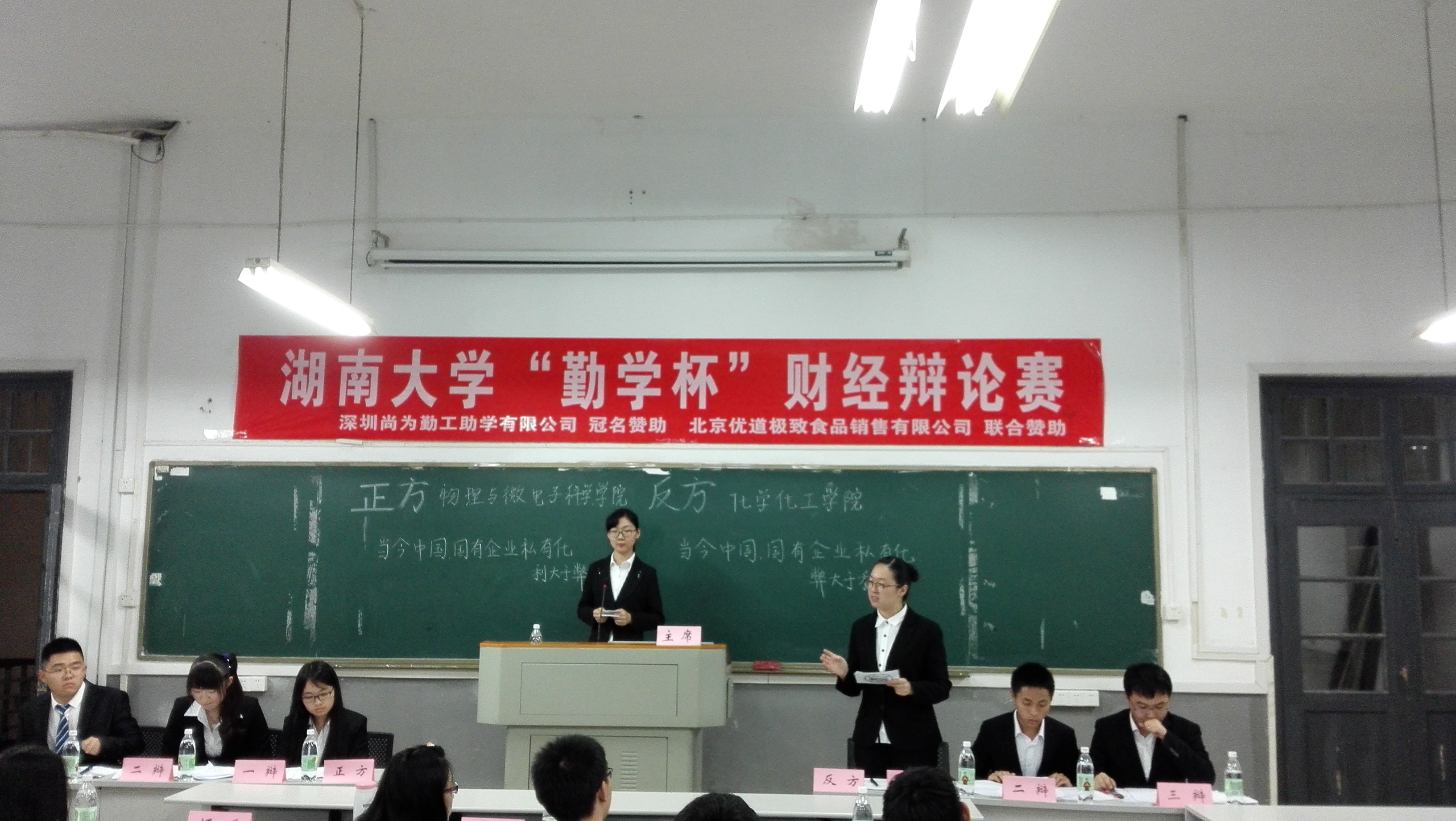 2016年5月7日晚七点,湖南大学“勤学杯”财经辩论赛在东楼304拉开序幕。本次辩论赛双方为正方物理与微电子科学学院和反方化学化工学院,辩题为当今中国国有企业私有化究竟是利大于弊还是弊大于利。经过一个小时的激烈争锋,物理与微电子科学学院最终赢得比赛。