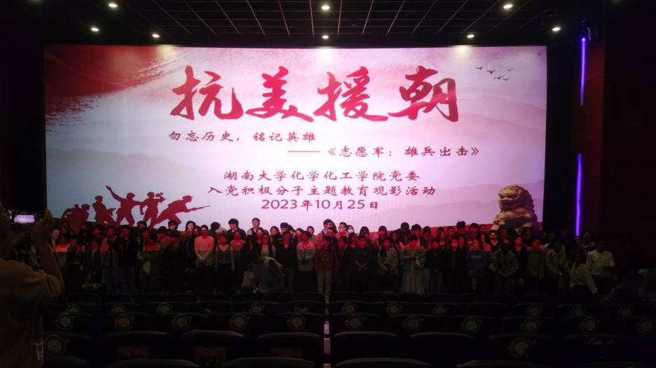 为纪念中国人民志愿军抗美援朝出国作战73周年,深入学习贯彻习近平新时代中国特色社会主义思想,弘扬爱国主义精神和伟大抗美援朝精神,厚植家国情怀,10月25日晚上19:05,化学化工学院党建服务中心组织入党积极分子集体观看红色电影《志愿军:雄兵出击》。