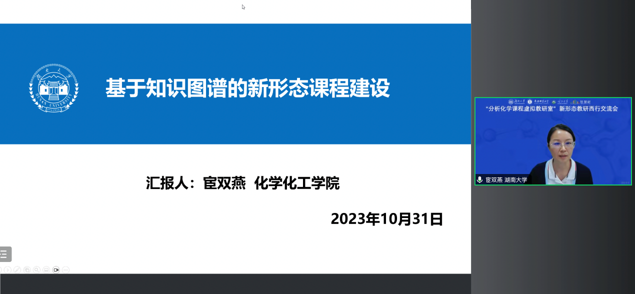 而后,湖南大学宦双燕教授以“基于知识图谱的‘分析化学’新形态课程建设”为题,向各参会成员进行了报告。宦教授分享了教育数字化转型背景下新形态课程建设的理念和实践,介绍了如何依托虚拟教研室平台开展新形态教研与知识图谱建设,并以湖南大学分析化学(1)为例详细介绍了如何建设和应用课程知识图谱和AI课程赋能教学。