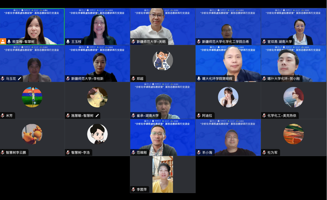 为深入推进慕课西部行2.0行动,探索基于新形态知识图谱的教研与教学形式,把虚拟教研室建设做实做深。2023年10月31日,湖南大学、新疆师范大学、喀什大学三校“分析化学课程虚拟教研室”新形态教研西行交流会顺利召开。来自三个学校的分析化学教学团队成员及智慧树网相关工作人员共计21人参会。会议由智慧树西行办税雪梅主持。
