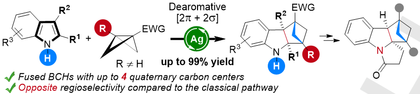 双环[2.1.1]己烷(BCHs)是一类新型的邻位和间位取代苯的三维(3D)生物电子等排体,其在药物研发领域中备受关注。湖南大学冯见君课题组报道了银催化吲哚与双环[1.1.0]丁烷去芳构化[2π+2σ]环加成反应,原子经济性合成双环[2.1.1]己烷并吲哚啉产物。利用银催化体系可在温和的条件下高效地实现N-无保护的吲哚与1,3-二取代的BCB底物的[2π+2σ]环加成反应,以高达99%的产率一步构建多达4个连续季碳中心,产物可以进一步衍生化构建复杂多环桥环体系。并且产物的单晶结构表明该环加成反应具有“反直觉”的区域选择性,即:环加成产物中吲哚的亲核性的C3位与BCB的亲核位点成键。这一现象表明银催化的[2π+2σ]反应经历了全新的反应模式。