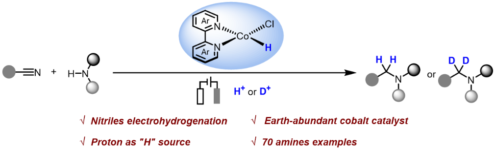 腈类化合物催化加氢合成胺一直以来都是学术界和工业界的重要反应之一。传统加氢反应一般使用氢气以及硼氢,硅氢等负氢物种作为还原剂。近日,湖南大学刘劼课题组报道了以质子作为氢源,通过电化学方式形成Co-H物种,使用广泛易得的腈类和胺类化合物为底物,实现了电化学腈类化合物还原胺化反应,合成了70个结构多样的仲胺和叔胺类化合物。通过化学反应动力学、同位素效应实验、电化学循环伏安以及恒电位电解等机理研究实验提出,阴极还原形成的钴氢物种向腈的氢转移步骤为决速步。此外,这种方法还可实现药物分子如氨氯地平的后期官能团化以及在胺上N原子的α位引入氘,为发展电化学高效、高选择性氘代同位素标记提供可行方案。