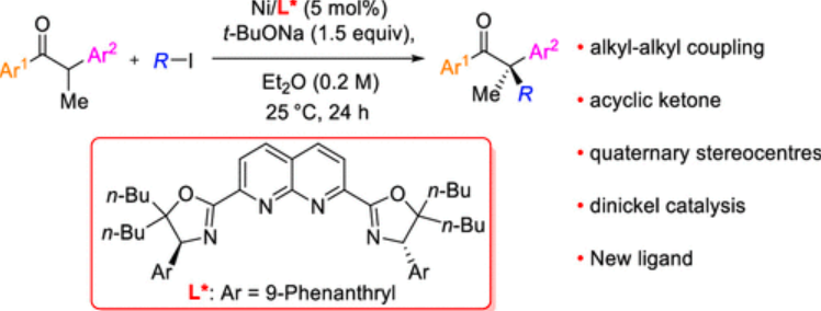 酮羰基α位与烷基卤代物的亲核取代反应是基础有机化学教材中的基本反应,是从简单酮类化合物构建复杂酮类化合物的基本手段。然而,对于非活泼烷基卤代物,如何实现该反应的对映选择性调控一直是有机化学的难题。近日,湖南大学陶忠林课题组以双镍配合物作为催化剂首次实现了非环状酮类化合物与非活泼烷基碘代物的不对称偶联反应,以较高收率和对映选择性得到a位含季碳手性中心的酮类化合物。反应具有较好的底物适用范围和官能团兼容性,反应的产物经过简单步骤就可以转化为含季碳手性中心的化合物。该类新型的双金属催化体系有望为羰基α位的直接不对称官能化反应提供有效工具。
