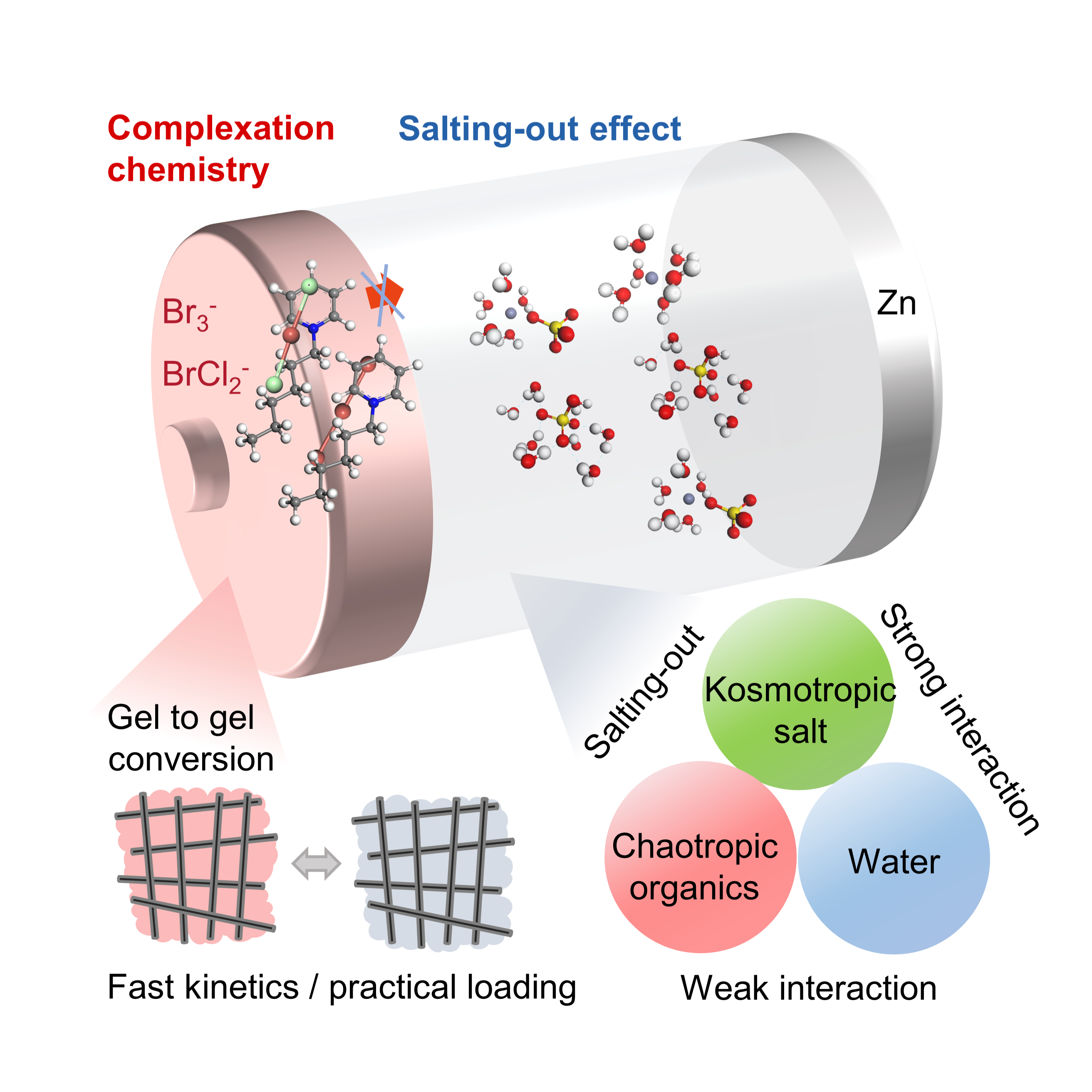 卤素四电子电化学反应(X-/X2/X+,X=I或Br)所涉及的聚卤离子(如ICl2-,Br3-,BrCl2-)在水系电解液中易溶解、水解,使得水系卤素电池实际能量密度偏低且易衰减。该团队利用电极中的季铵络合效应增强聚卤离子的化学稳定性、水系电解液中硫酸盐析排斥效应,解决了聚卤离子的溶解和水解问题,阐明了络合-盐析协同作用机制。该作用机制进一步构建了分子拥挤型的凝胶化电极,抑制了析氧、析氯副反应,并克服了传统转化型正极反应的动力学挑战。