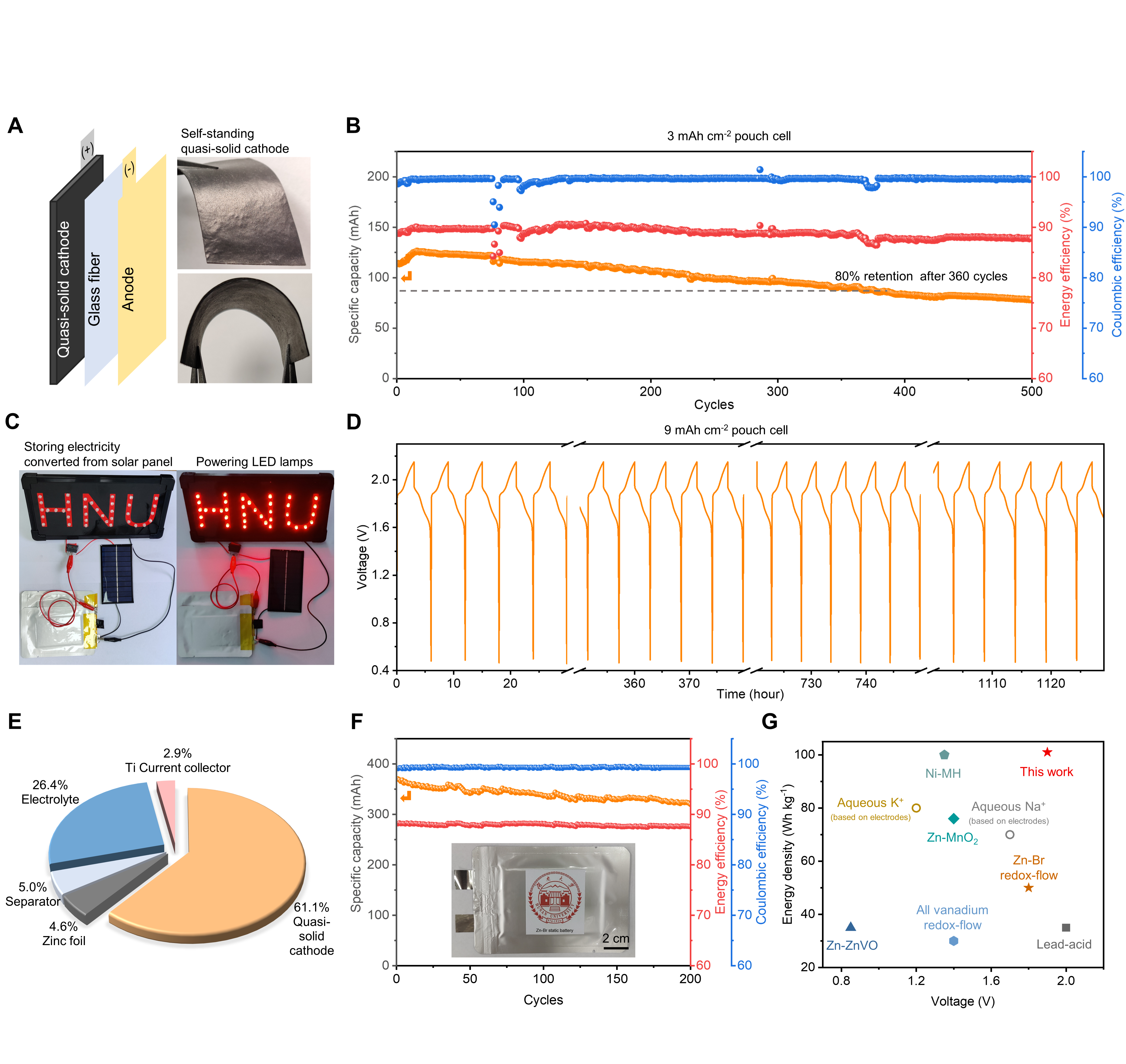 该团队通过软包电池展示了四电子锌溴电池的高能量密度(106 Wh kg-1)、低材料成本($ 28 kWh-1)、及优异的能量效率(88.9%),在储能领域展现出较大的应用潜力和优势。