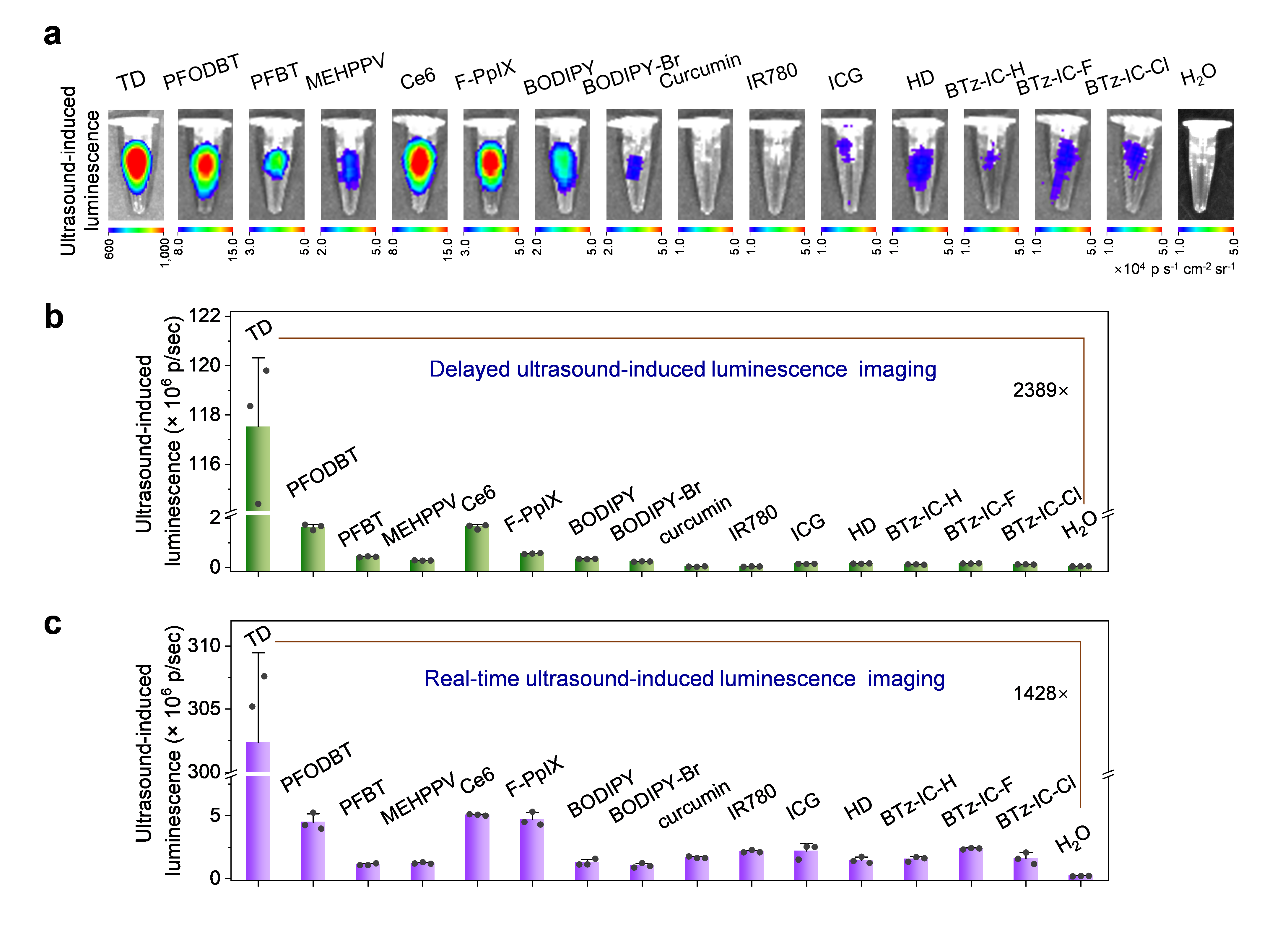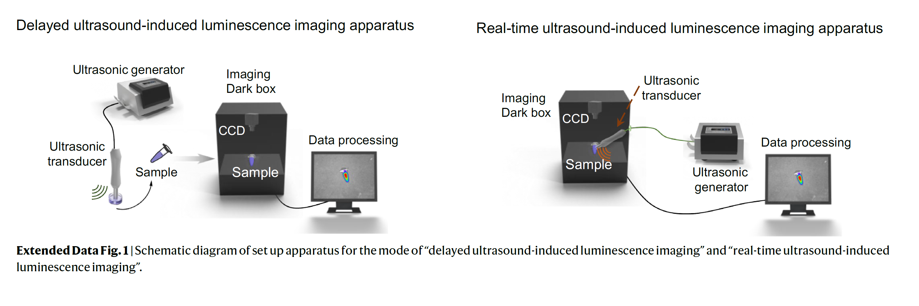 分子成像技术用于可视化和定量分子和细胞生物过程,进行疾病的检测、诊断、预测和监测。然而,依赖实时光激发的荧光成像往往受到组织自发荧光的影响,降低了活体组织成像灵敏性和特异性,生物发光或化学发光信号则往往受到活体中酶微环境或底物分布的影响。超声成像技术在医学临床诊断中被广泛使用,它通过超声波的传输、反射和散射原理,映射出人体内部结构的图像。声致发光是一种在高强度超声作用下,液体空化而产生的微弱发光现象,然而,其发光效率低、发光强度弱、超声暴露时间长,发光寿命极短。