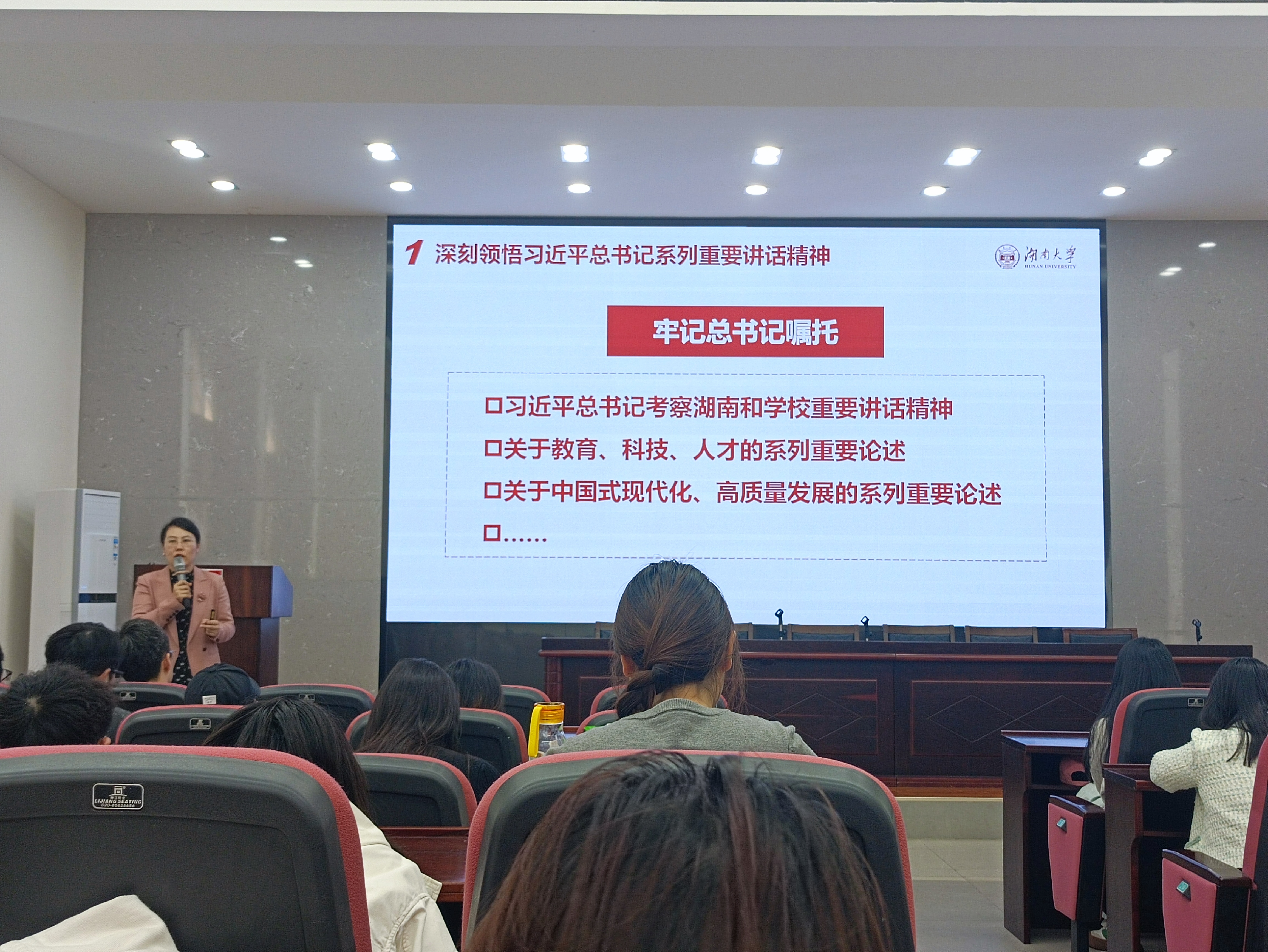 4月12日下午,学习中国共产党湖南大学第十次代表大会精神专题宣讲会在新化工楼D区报告厅举行。学院党委副书记李洪玉主讲,学生党支部书记、毕业生党员和预备党员参加会议学习领悟。