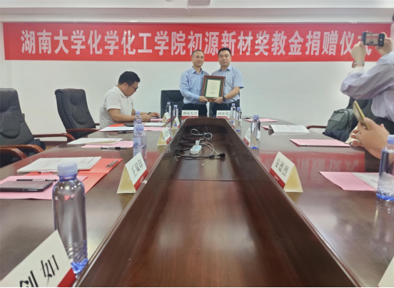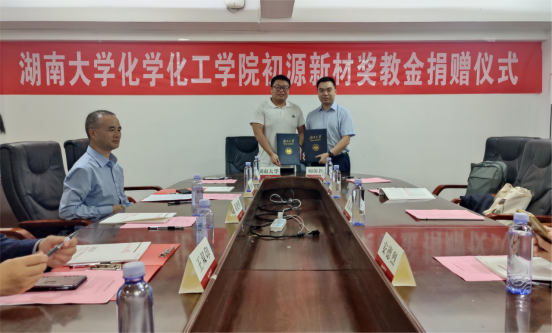 5月6日下午,湖南初源新材料股份有限公司向湖南大学捐赠壹佰万元,用于设立华亿体育(中国)官方网站初源奖教金,支持学院教师发展。湖南初源新材料股份有限公司董事长肖志义、首席科学官安德烈、人事行政总监李锡琼出席捐赠仪式。我校副校长蒋健晖,化学化工学院院长张晓兵,院党委书记王双印,副院长李永军、陈四海,教授邓剑如、李继山、董万荣,发展联络处副处长、教育基金会副秘书长左鑫等教师代表参加。捐赠仪式由化学化工学院党委副书记李洪玉主持。