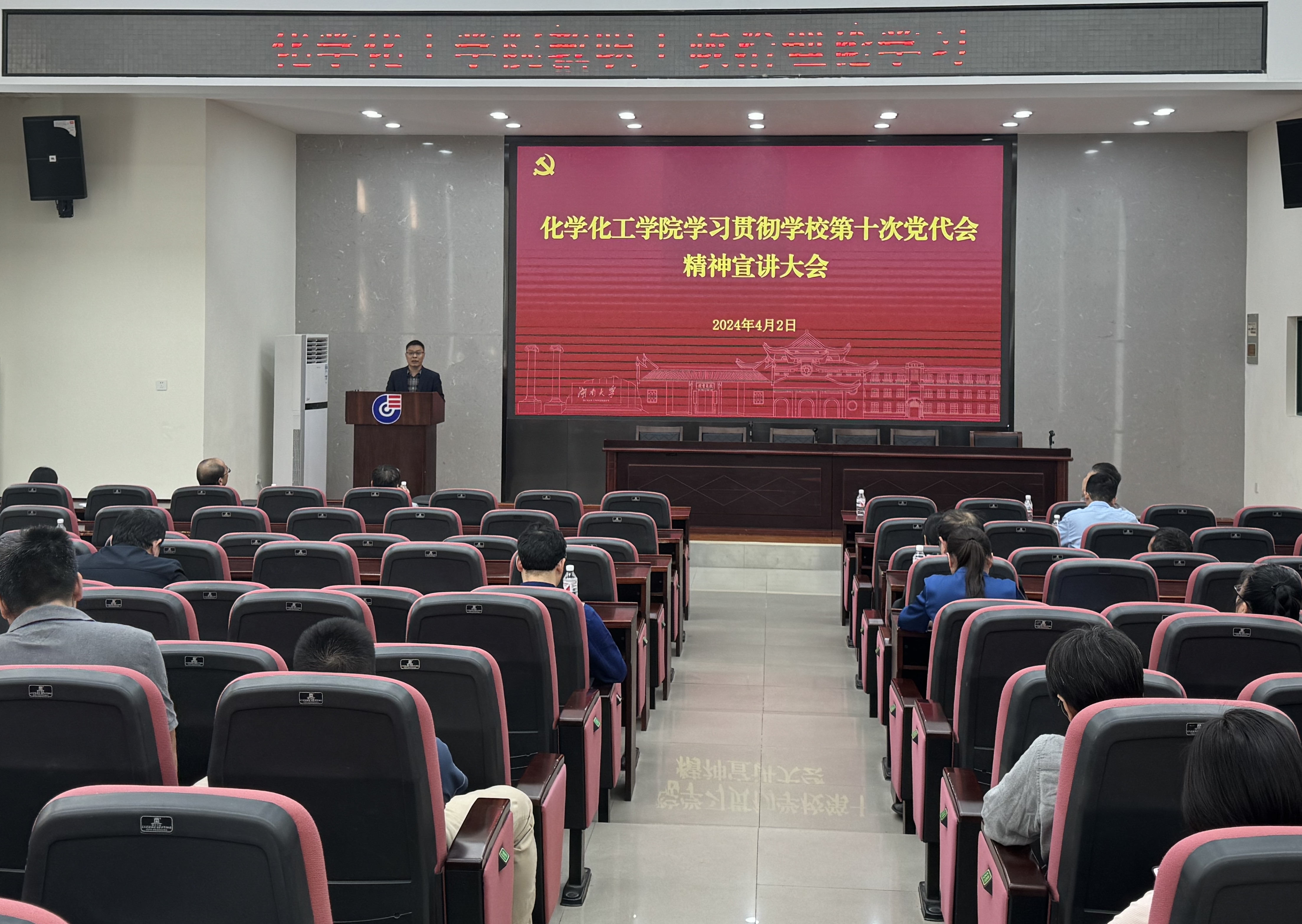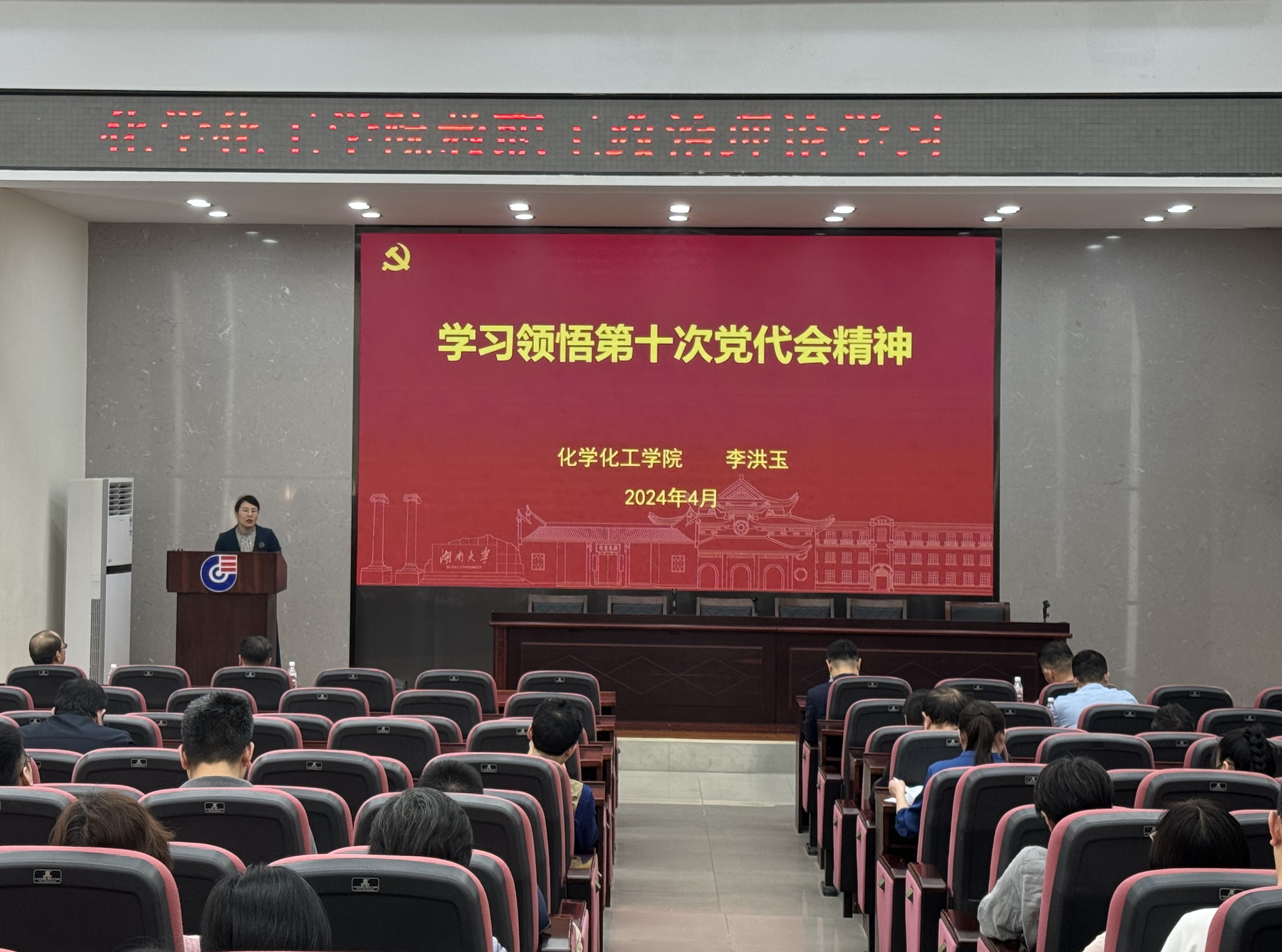 之后,李洪玉对大会主题和主要内容进行深入解读,传递了第十次党代会的重要精神,强调化学化工学院全体教职员工要结合科研实际,坚定文化自信,把思想和行动统一到党代会确定的目标和方向上,坚定不移传承好传道济民的办学宗旨、经世致用的价值取向、实事求是的思想精髓,在教学和科研工作中要传承好学院历史文化,把化学化工学院专业文化、人文情怀撒在各行各业,凸显湖大学子应有的精神风貌。