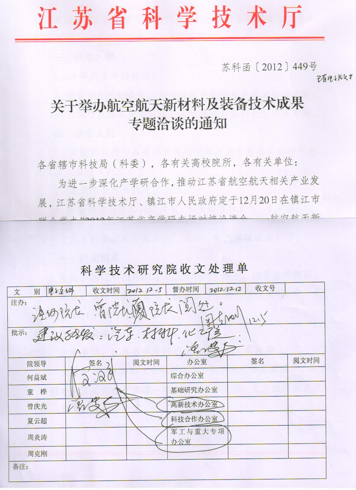 江苏省科学技术厅 苏科函〔2012〕449号 关于举办航空航天新材料及装备技术成果 专题洽谈的通知 各省辖市科技局(科委),各有关高校院所,各有关单位: 为进一步深化产学研合作,推动江苏省航空航天相关产业发展,江苏省科学技术厅、镇江市人民政府定于12月20日在镇江市联合举办“2012年江苏省产学研专场对接洽谈会——航空航天新材料及装备技术成果专题洽谈”活动。有关事项通知如下: 一、时间地点 时间:2012年12月20日(上午9:00开始),19日全天报到。 地点:镇江明都大饭店(镇江新区丁卯智慧大道470号,总机电话0511—88778888)。 二、办会单位 主办单位:江苏省科学技术厅,镇江市人民政府 支持单位:中国商飞公司设计院,中国航天科工集团三、四、六院,中国航天科技集团一院,西北工业大学,北京航空航天大学,南京航空航天大学 承办单位:江苏省生产力促进中心,镇江新区管委会,镇江市科技局 三、活动内容 1、开幕式及专题报告; 2、全省相关企业负责人与参会高校院所专家现场对接洽谈; 3、对接洽谈结束后组织部分高校院所专家赴企业实地考察。 四、参会人员 1、前期预对接中各省辖市报送的有意向对接洽谈的相关企业负责人或技术副总; 2、邀请参会的高校院所专家; 3、各省辖市科技局分管局长、相关处室负责人,有关县(市、区)科技局分管局长、相关科室负责人; 4、主办单位和支持单位相关领导。 五、有关要求 1、请各省辖市科技局将本辖区参会人员名单,请各有关高校院所科技处将本单位参会人员名单,于12月12日下班前同时报送镇江市科技局科技合作处(邮箱:此邮件地址受spam bots保护,需要使用 Javascript 功能来查阅。)和江苏省生产力中心产学研部(邮箱:此邮件地址受spam bots保护,需要使用 Javascript 功能来查阅。)。 2、请各省辖市科技局、各有关高校院所科技处明确1名联络员于12月19日19:30到镇江明都大饭店参加预备会。请所有参会人员于12月20日08:45前进入开幕式会场。 3、本次会议统一安排食宿,除办会单位代表外,其他参会人员住宿费用自理。 联系人: 镇江市科技局科技合作处 徐光陆 电话:0511—80822818,13776474778 江苏省生产力促进中心产学研部 李岱 电话:025—85485968,18751848744 江苏省科技厅产学研合作处 郑东明 电话:025—83363139 附件:参会人员名单回执表 江苏省科学技术厅 2012年12月4日 附件: 参会人员名单回执表 报送单位:————,联络员姓名:————,职务:————,手机号码:————
